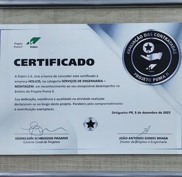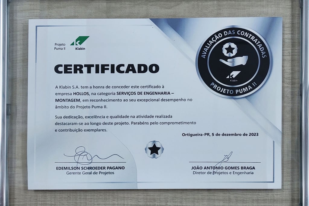 No mês de dezembro de 2023 a Hollos Service recebeu com muita alegria a certificação de fornecedores do Projeto Puma II, fruto de um ótimo trabalho com muita sinergia e dedicação, a Hollos Service agradece a Klabin pela confiança.
